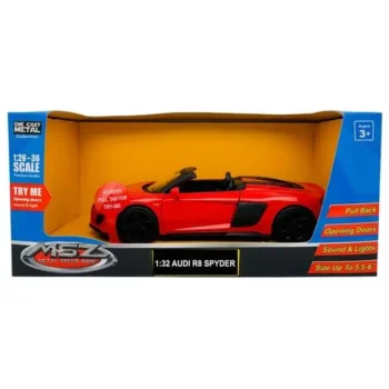 The Audi R8 Spyder 1:32 scale model is a roadster built for your shelf or toy races. Its sporty design is both bold and refined. • Die-cast body with open-top look • Smooth, glossy finish • Compact yet detailed • Great for collections or desk display • Age 6+ recommended