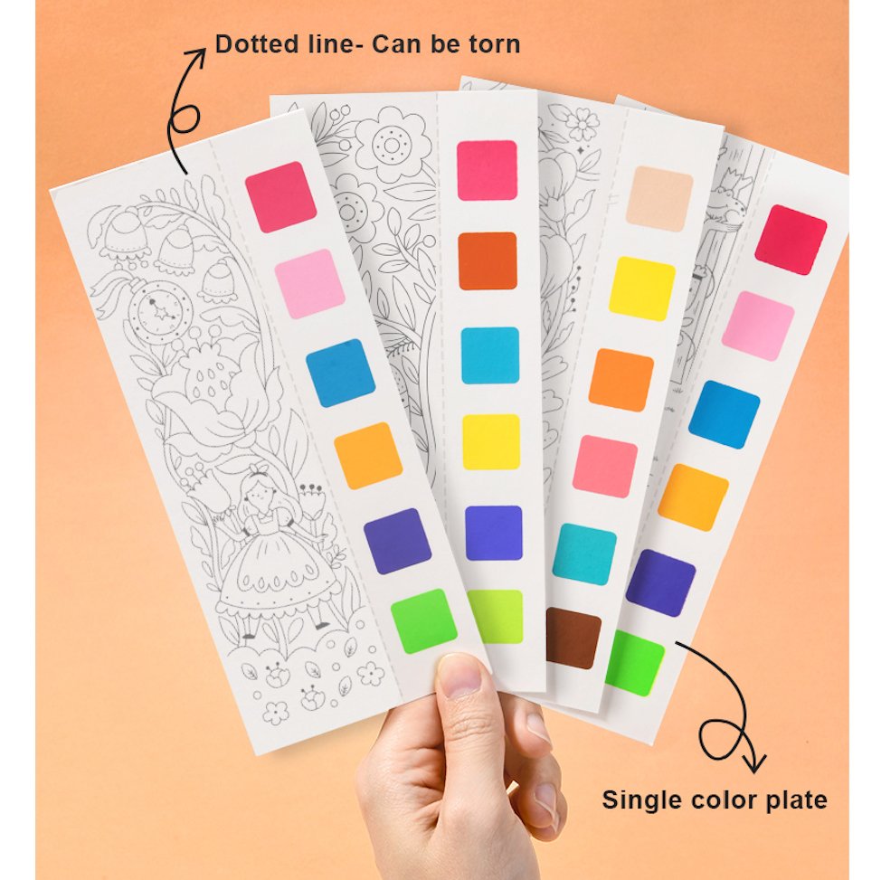 This is the ultimate painting kit for your aspiring artist. No need to carry bulky water paints or palettes. The painting book includes paint swatches for each individual sheet. Just wet the included paintbrush with a little water, gently smear it on the paint swatches, and then color the picture to create your own masterpiece! The portable and compact design makes it an ideal travel companion for your child. The paint swatches can easily be torn after the painting is complete and the painting can be used as a bookmark or stick it on the fridge as you show off their work with pride.