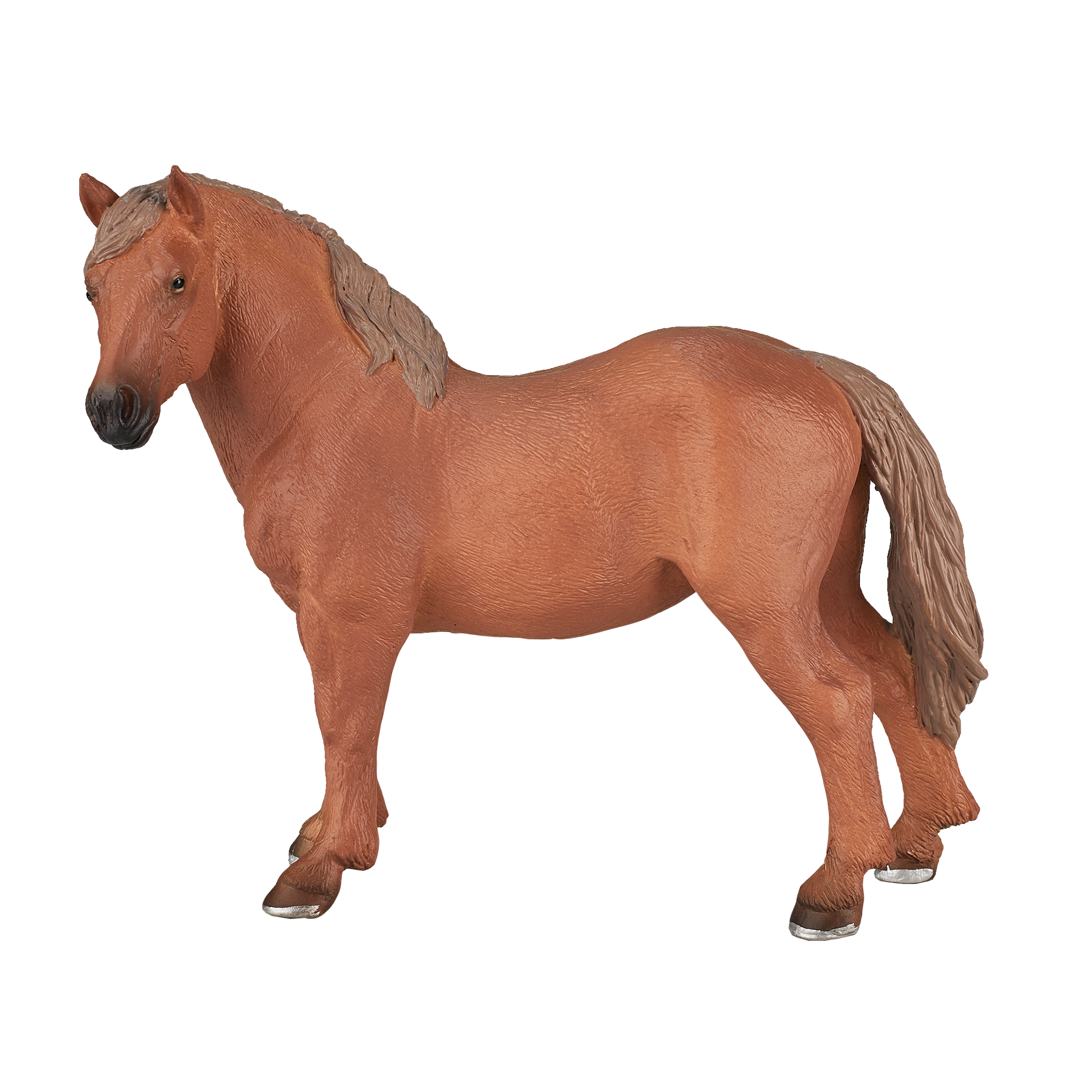 Design: Features a realistic standing pose with intricate details, showcasing the horse’s muscular build, rich chestnut coat, and expressive eyes.