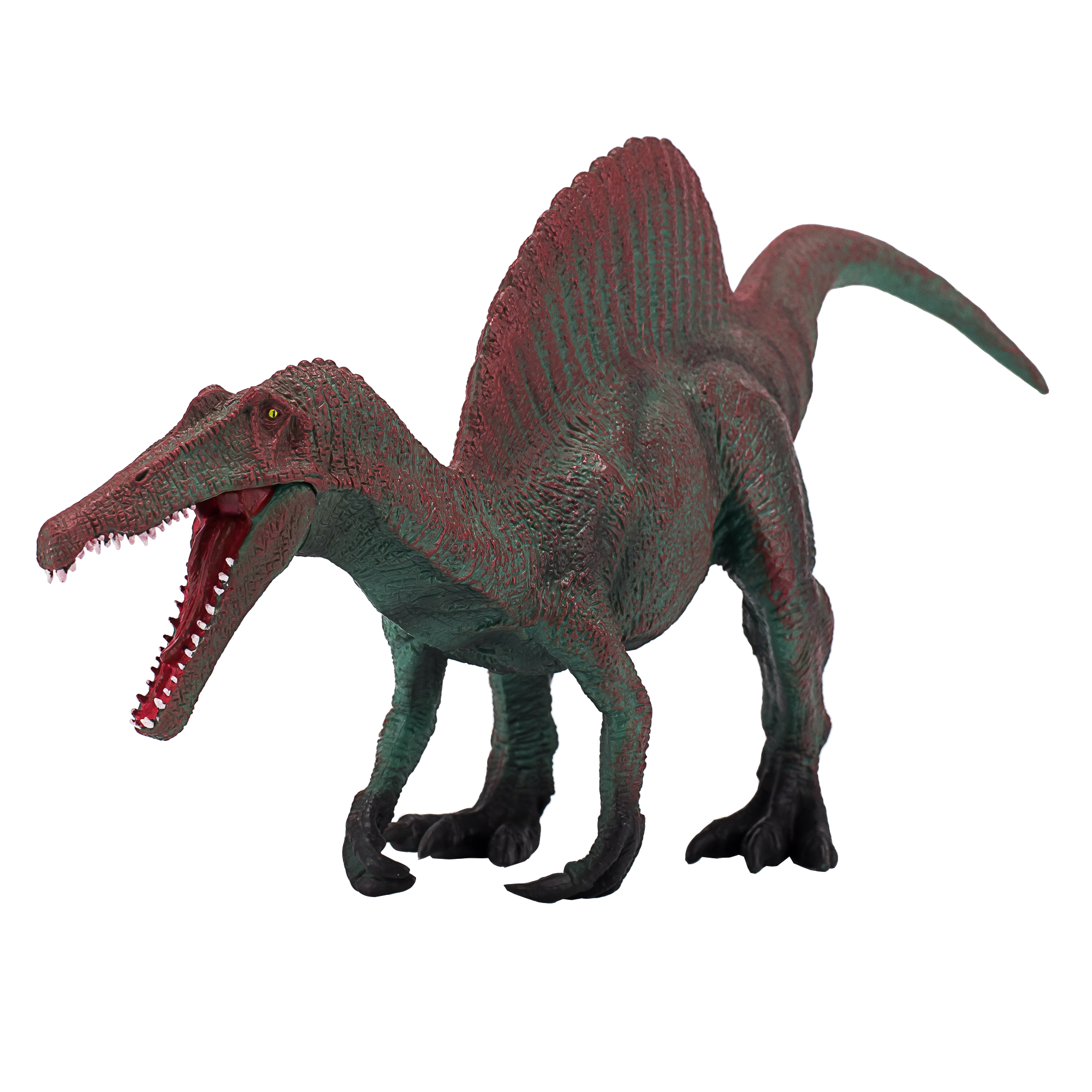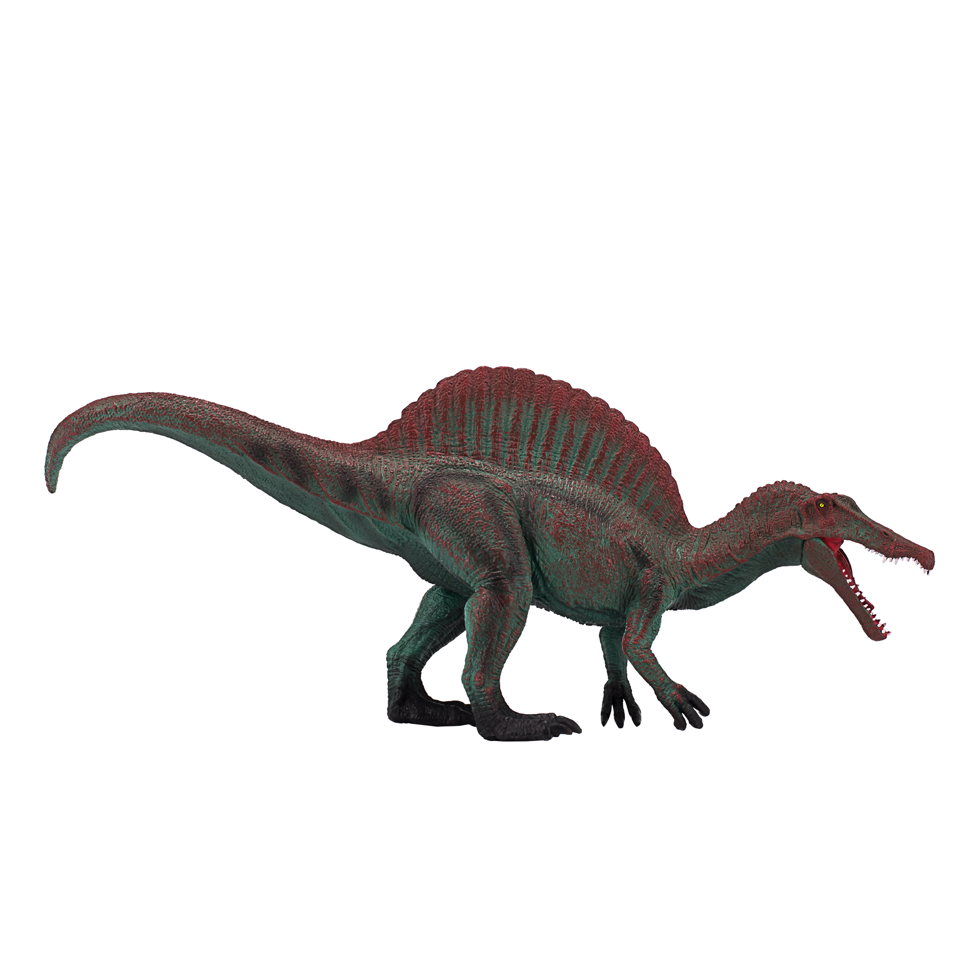 Design: Features a realistic standing pose with intricate details, showcasing the Spinosaurus’s sail-like dorsal fin, sharp teeth, and muscular build.