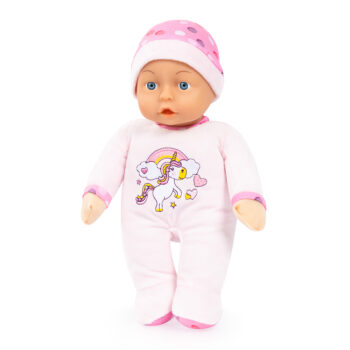 This lovely baby doll with beautiful big eyes (approx. 30 cm) has 24 baby sounds. She laughs, giggles, babbles, cries sounds as soon as you press her tummy. Eating time! Just like a real baby, the doll smacks and moves the mouth when she gets her bottle. To comfort the little darling a pacifier is included in the delivery. Thanks to her soft body and her cosy outfit as well as her sweet look, she is perfect to hug and cuddle. Batteries are already included.